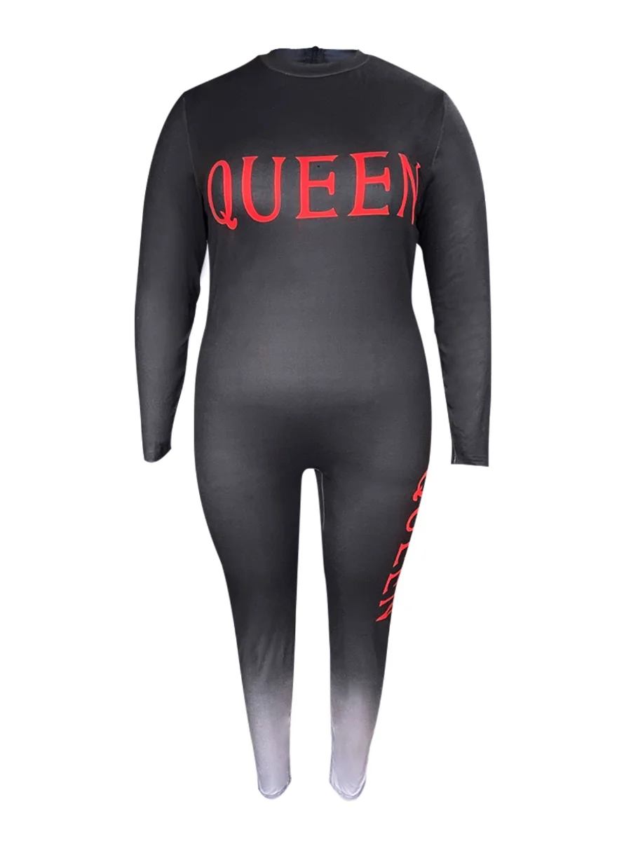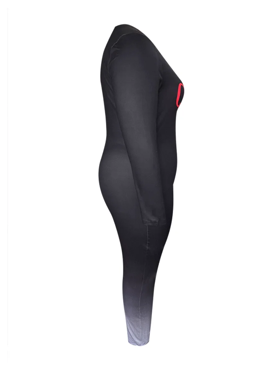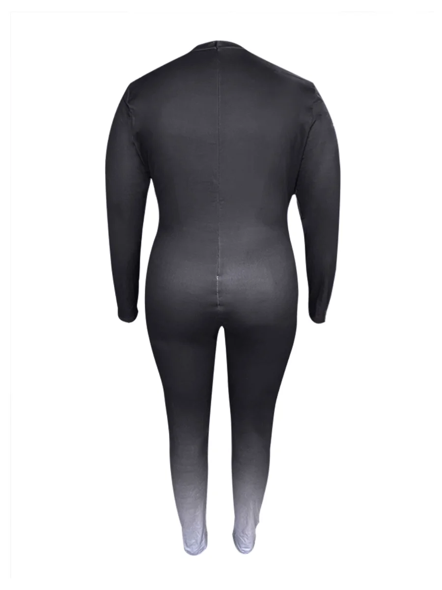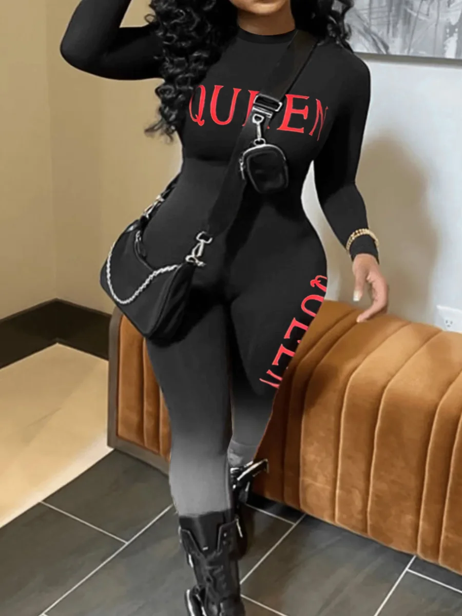 LW plus size Jumpsuit Women's Letter & Ombre Print Long Sleeve Round Neck Skinny Jumpsuit Autumn Spring Long Pants