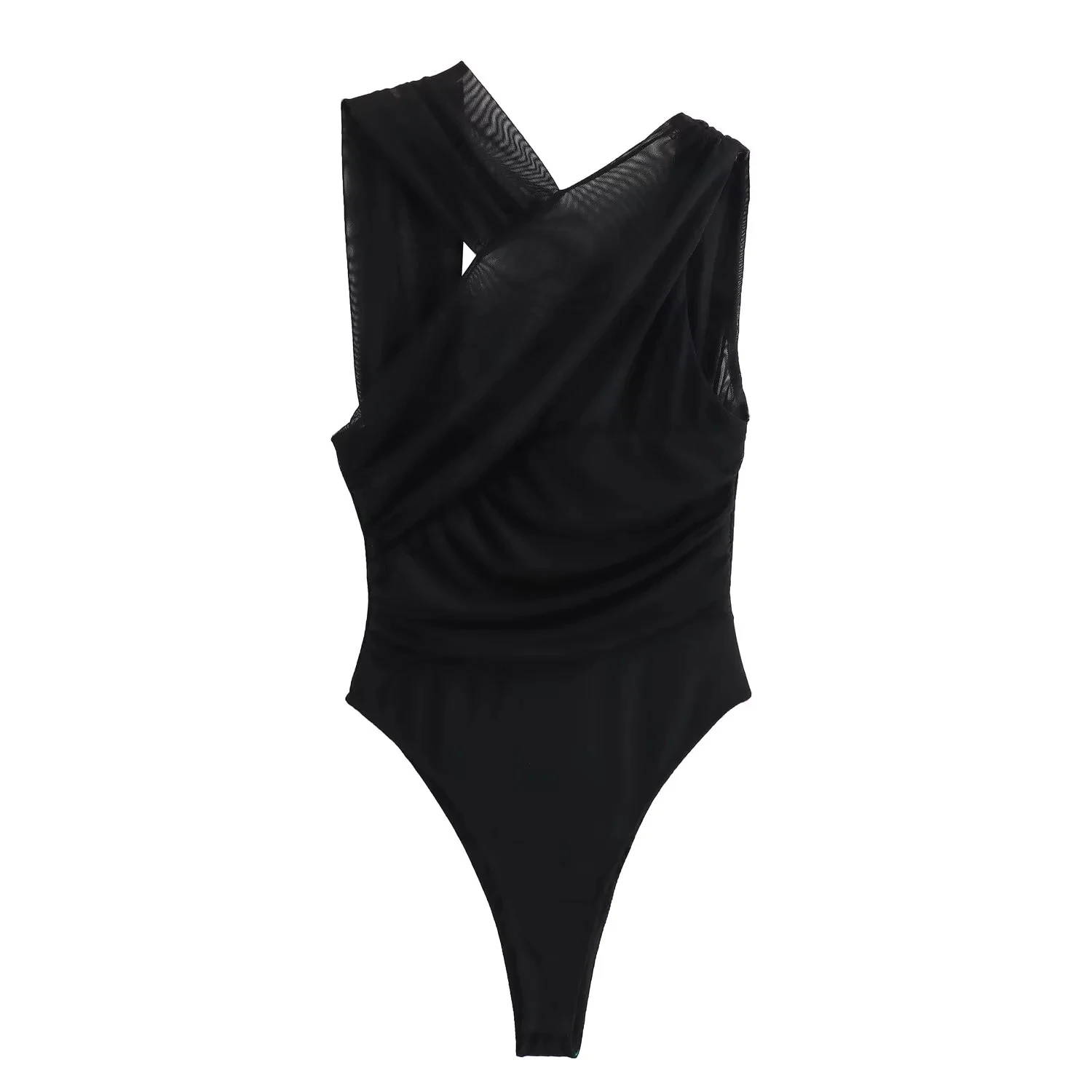 TRAF Woman Body Leopard Tulle Bodysuit Pleated Asymmetric Animal Print Body For Women Summer Backless Sexy Mesh Black Bodysuit